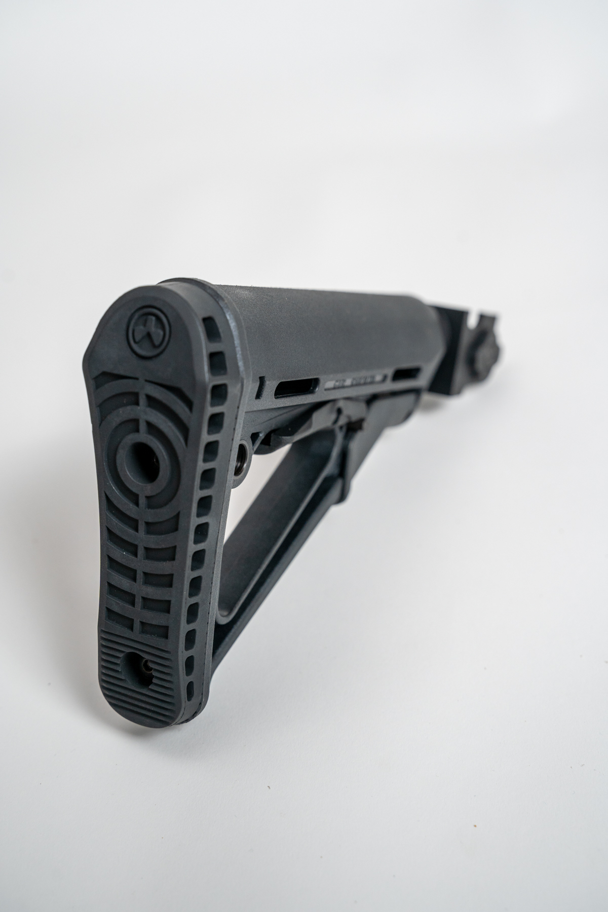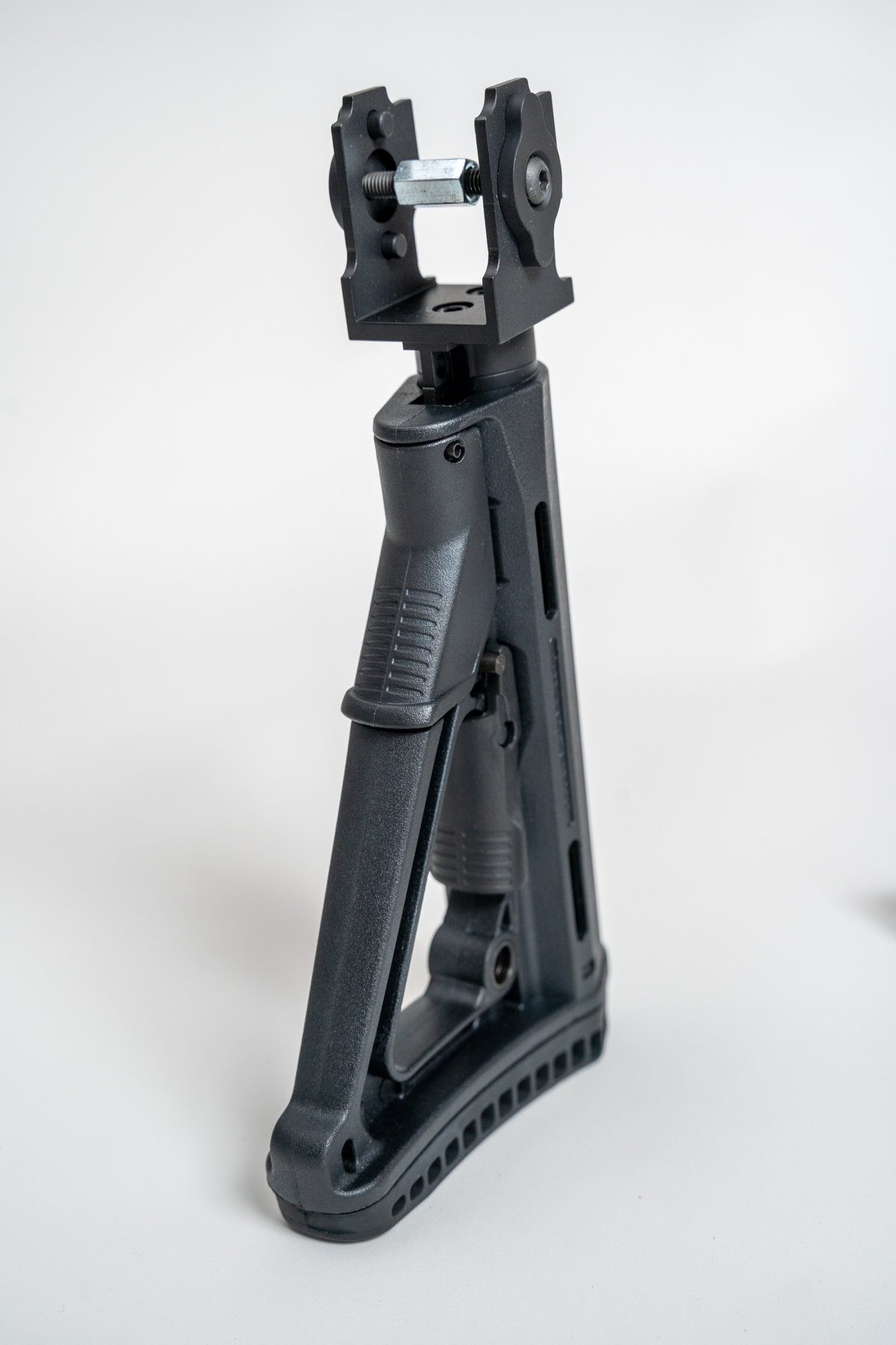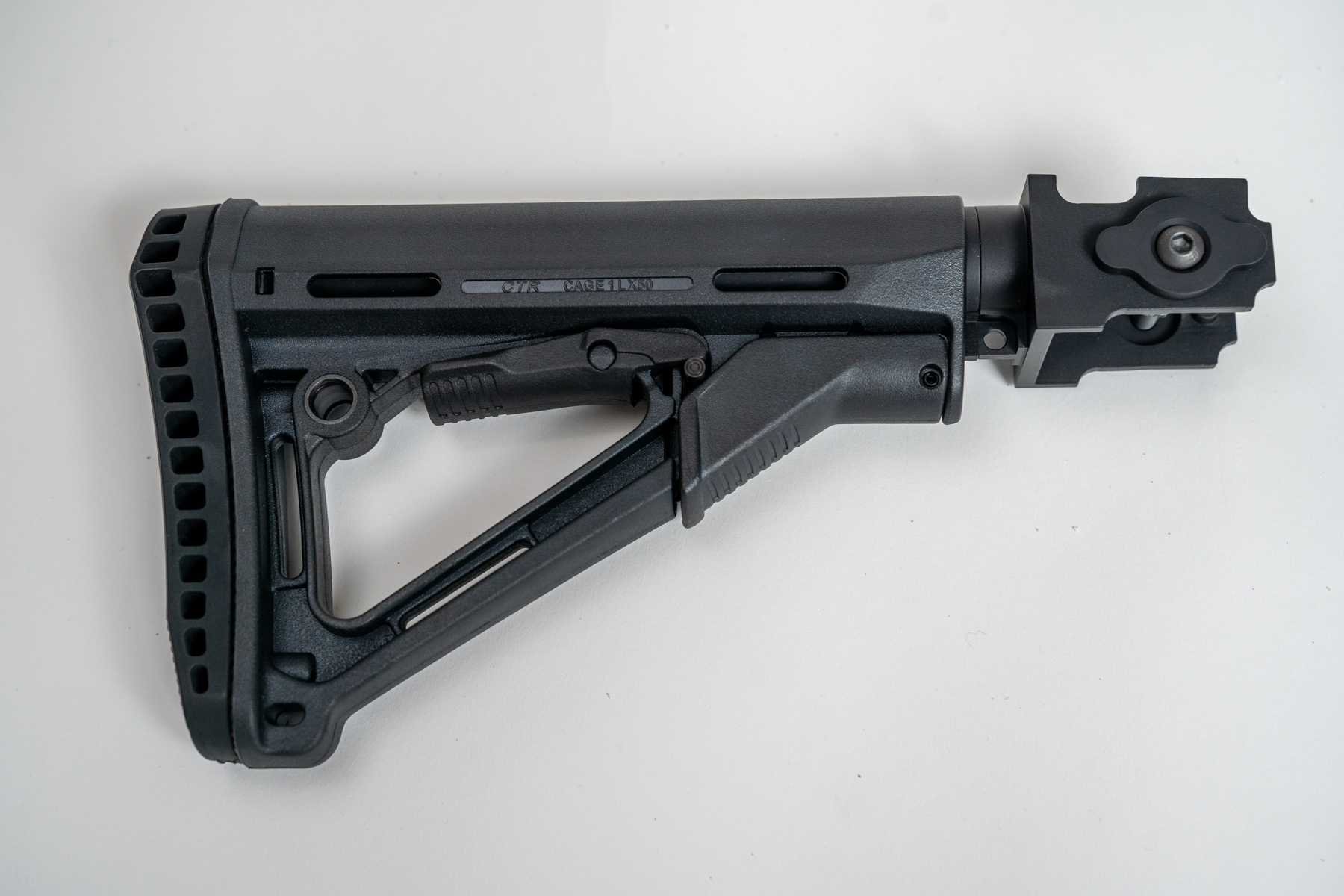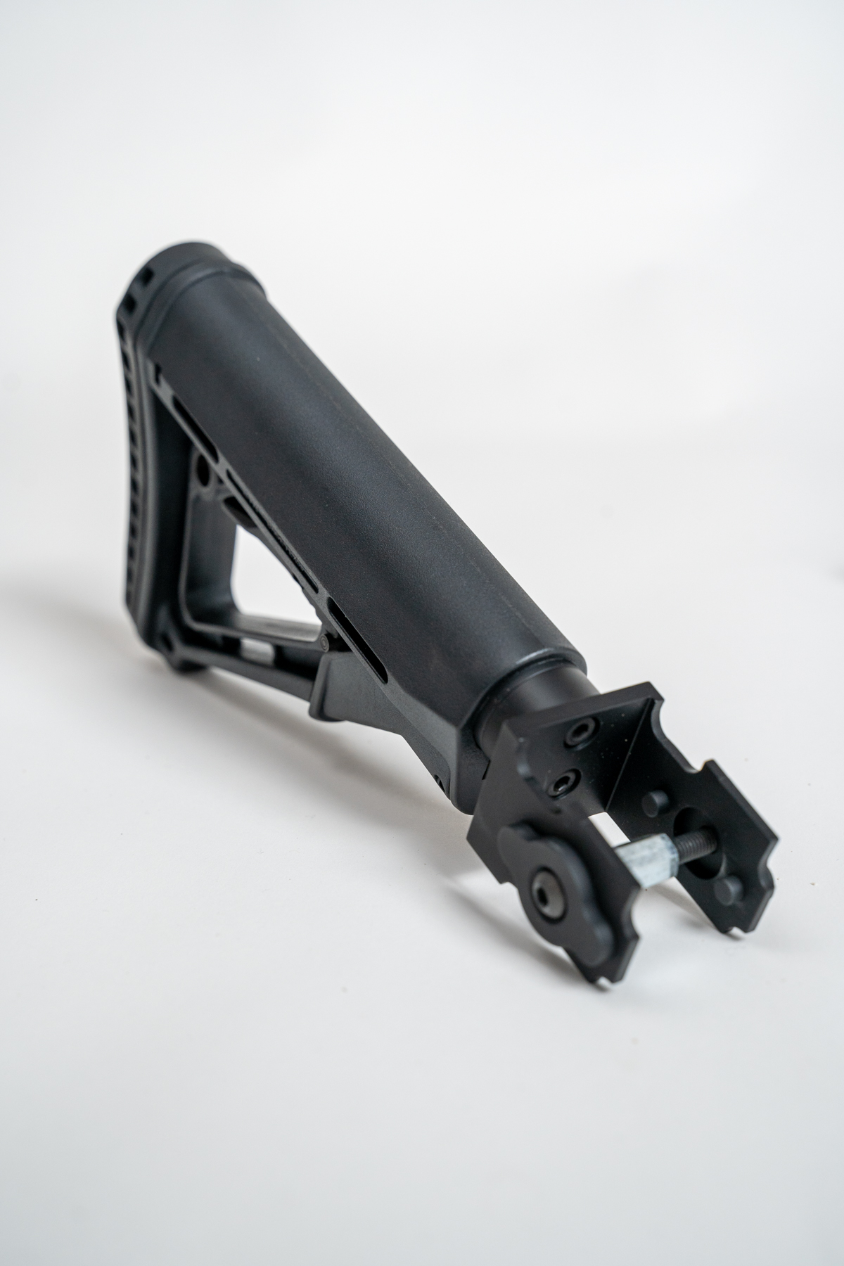 The folding stock is removed and replaced with a telescopic stock, which is secured with a screw. The stock mount is made of aluminum, while the extendable stock is made of reinforced plastic, allowing for length adjustment.
