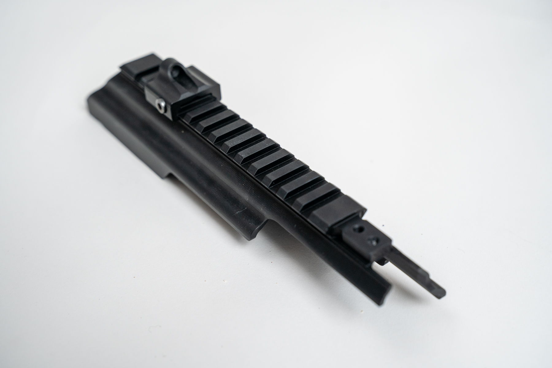 The receiver cover is replaced with a new one by removing the mechanical sight and the spring plate. A new mount is screwed onto the existing structure, which also secures the front of the receiver cover. The rear attachment remains unchanged and is held in place by the return spring.