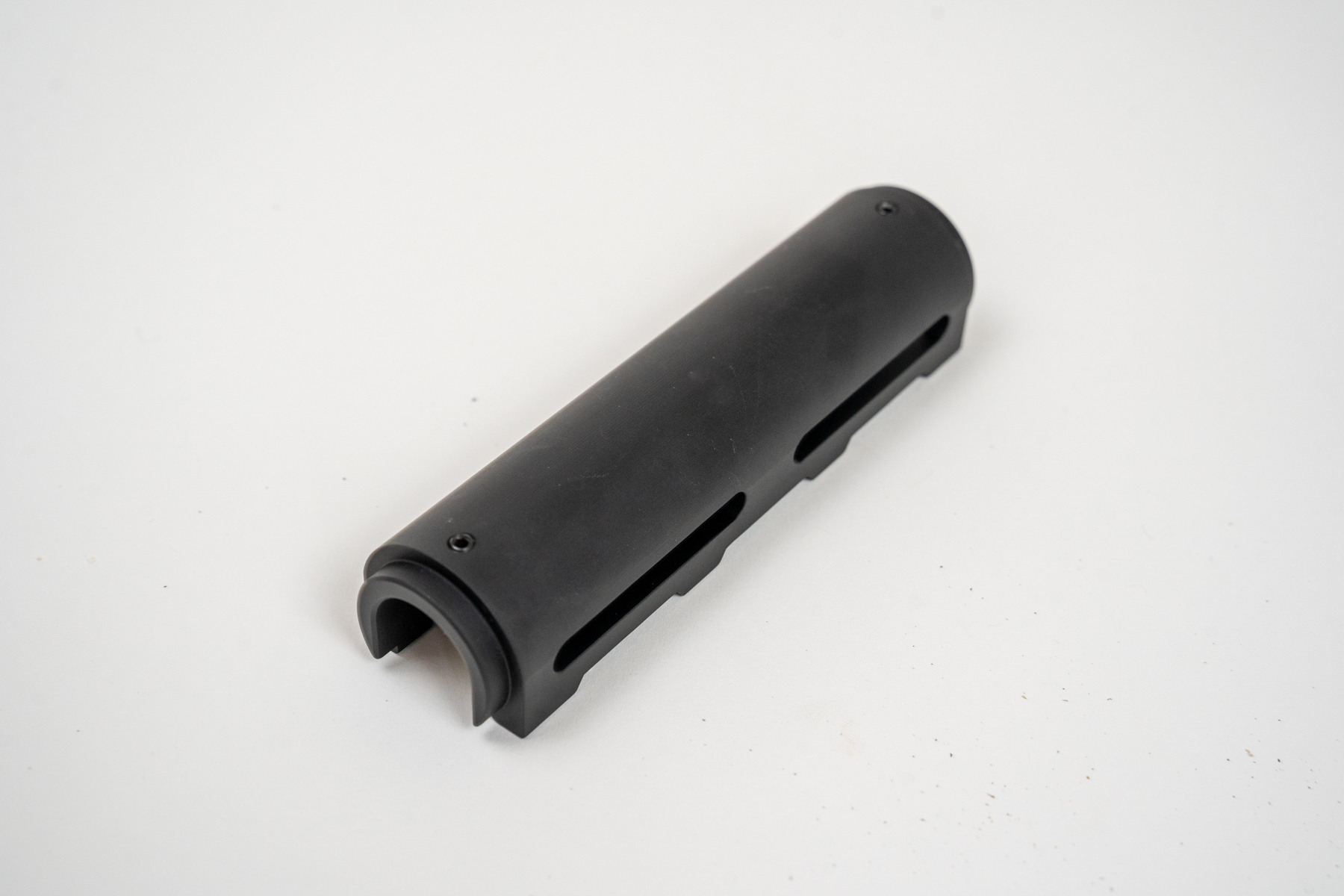 The gas tube remains the same, but the wooden cover is rotated 180 degrees and then removed. A new cover is inserted and secured with screws that are built into the handguard itself.